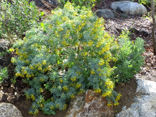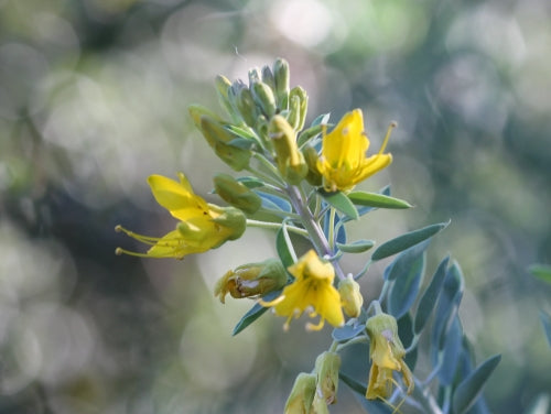 Bladderpod (Peritoma arborea) is an evergreen shrub native to California and Baja California. Growing up to 6ft tall, its leaves are composed of three oval leaflets, and it produces bright yellow flower clusters. Each flower has four petals, six curly stamens, and a protruding style that holds the developing fruit. Its dense branching and drought tolerance make it an excellent accent or low-water addition to lush landscapes.