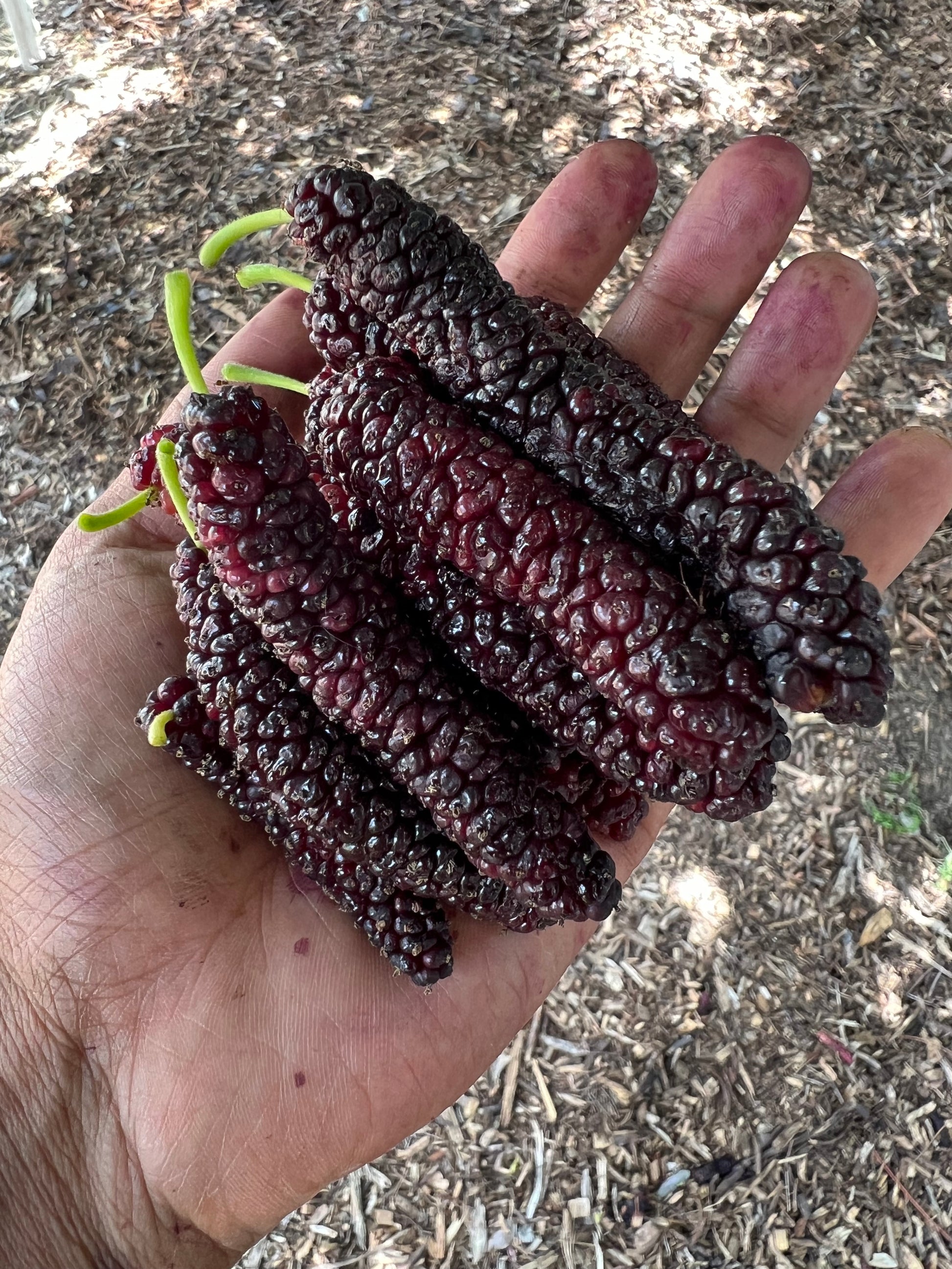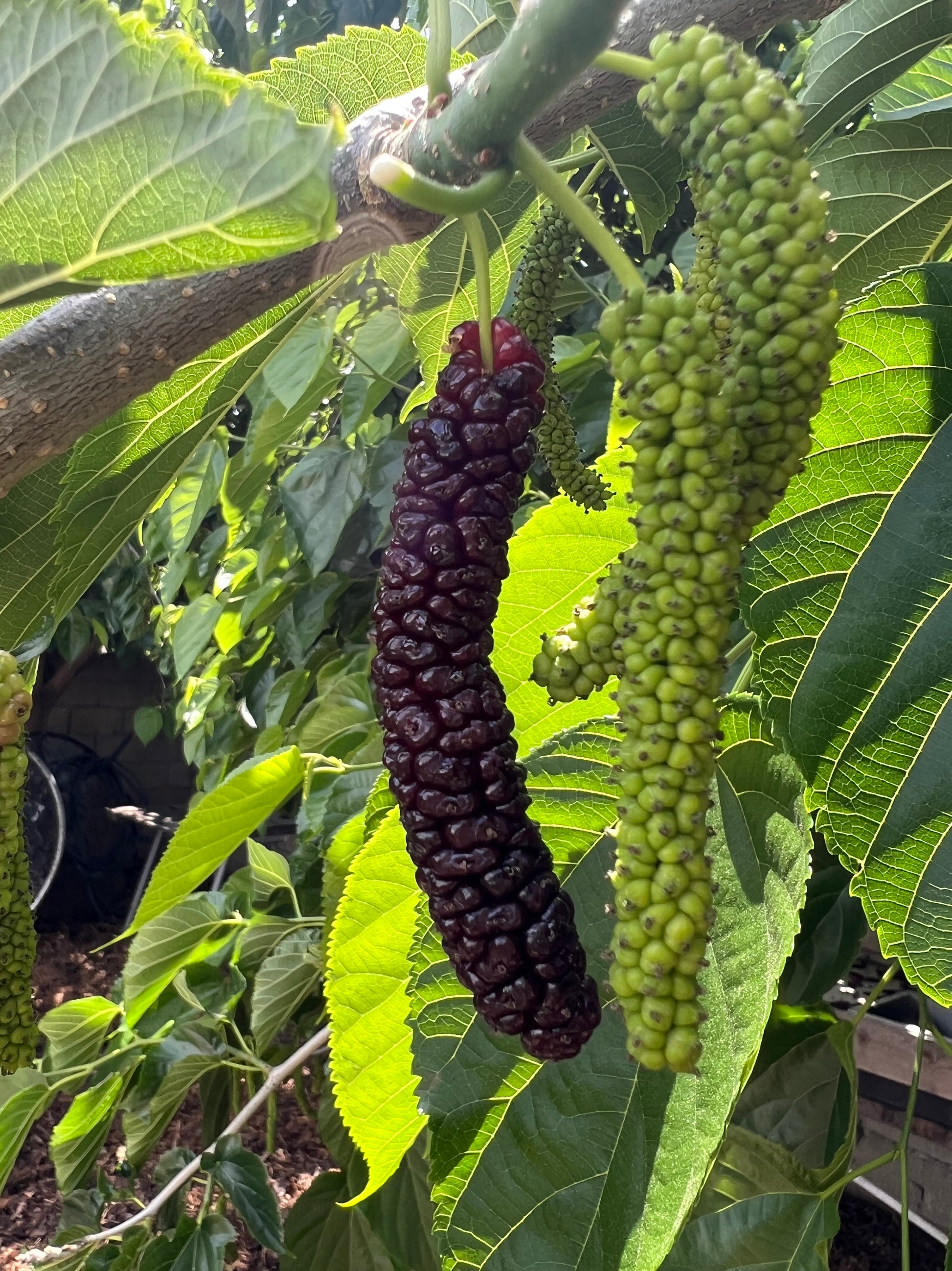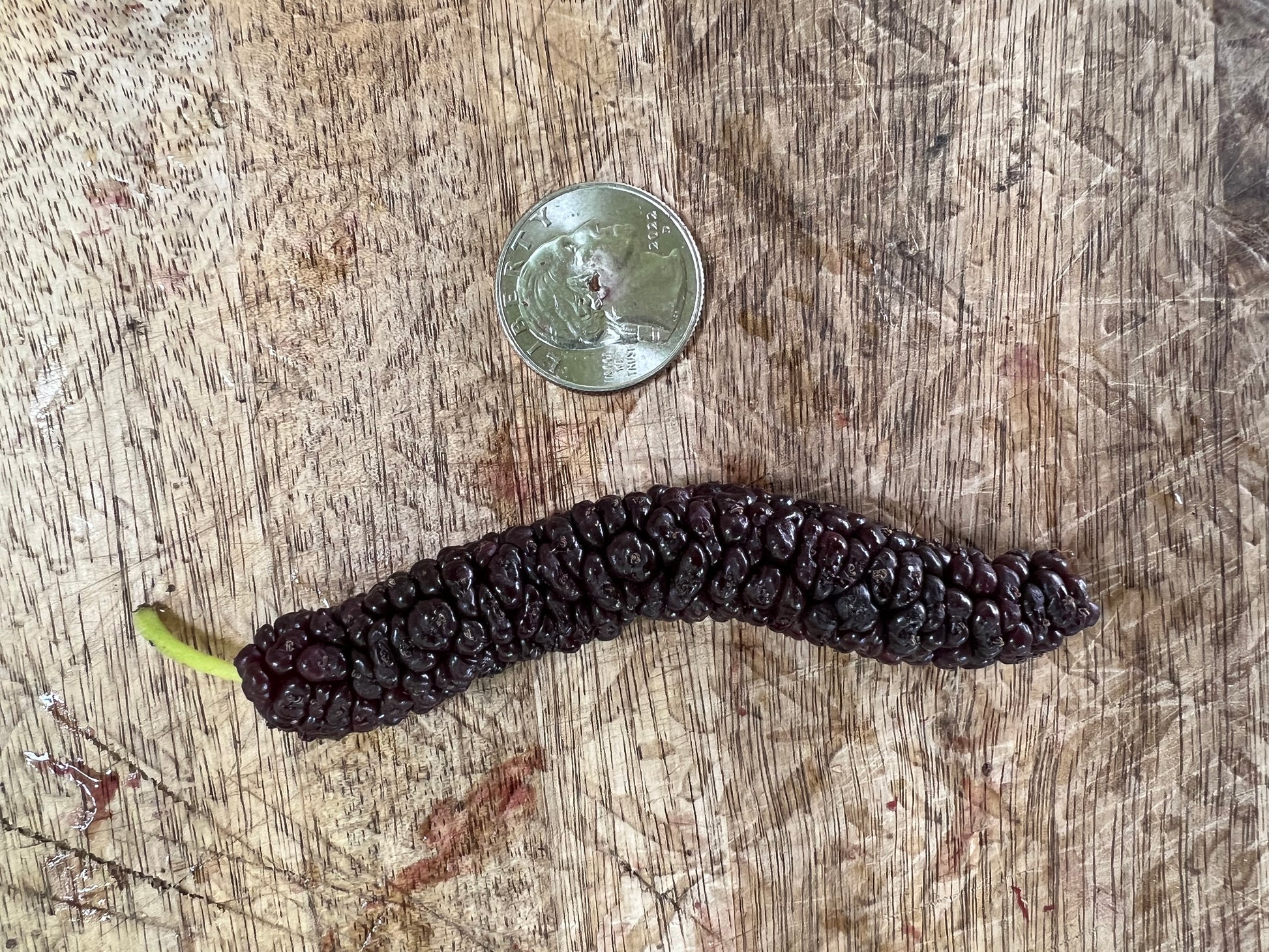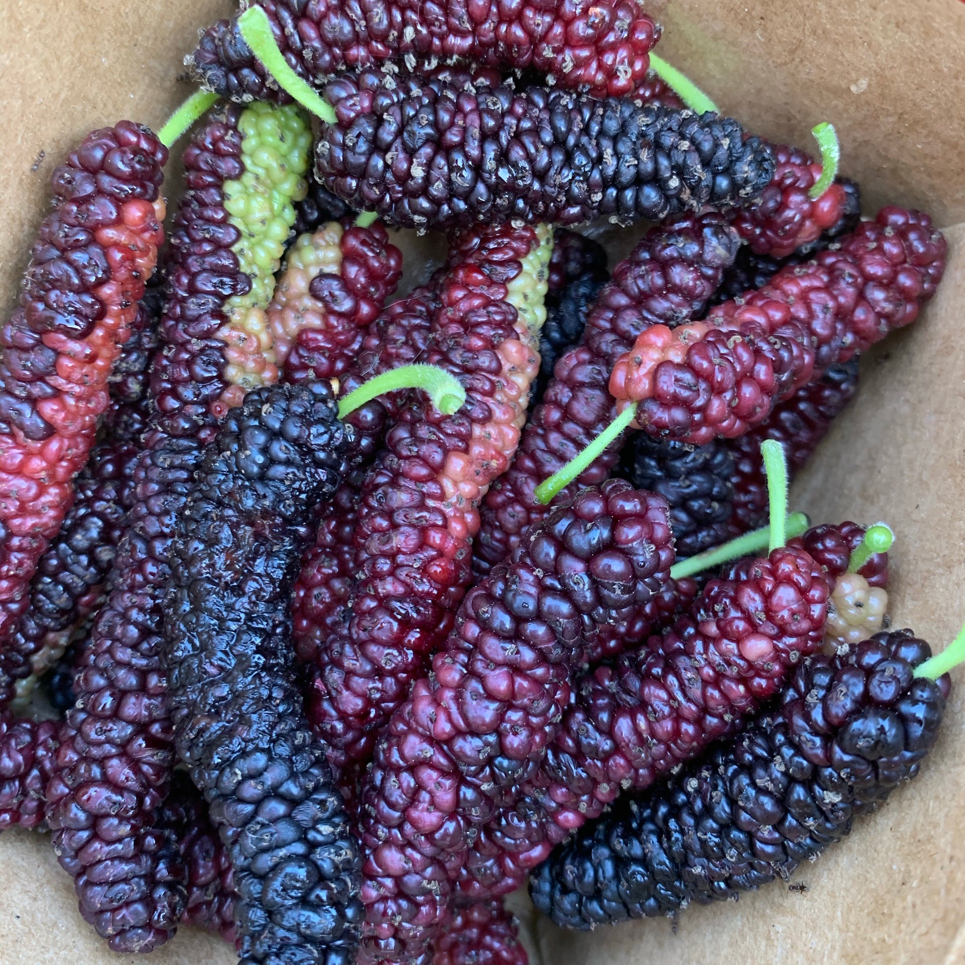 The Pakistan mulberry is the “king” of the fruiting mulberries, producing 3 1/2″ to 5″ long maroon to black berries. They are very sweet and flavorful with a raspberry like flavor. Juice does not stain. It has multi-month long fruiting season starting heavy in late spring/early summer and continuing to fruit until mid-summer.