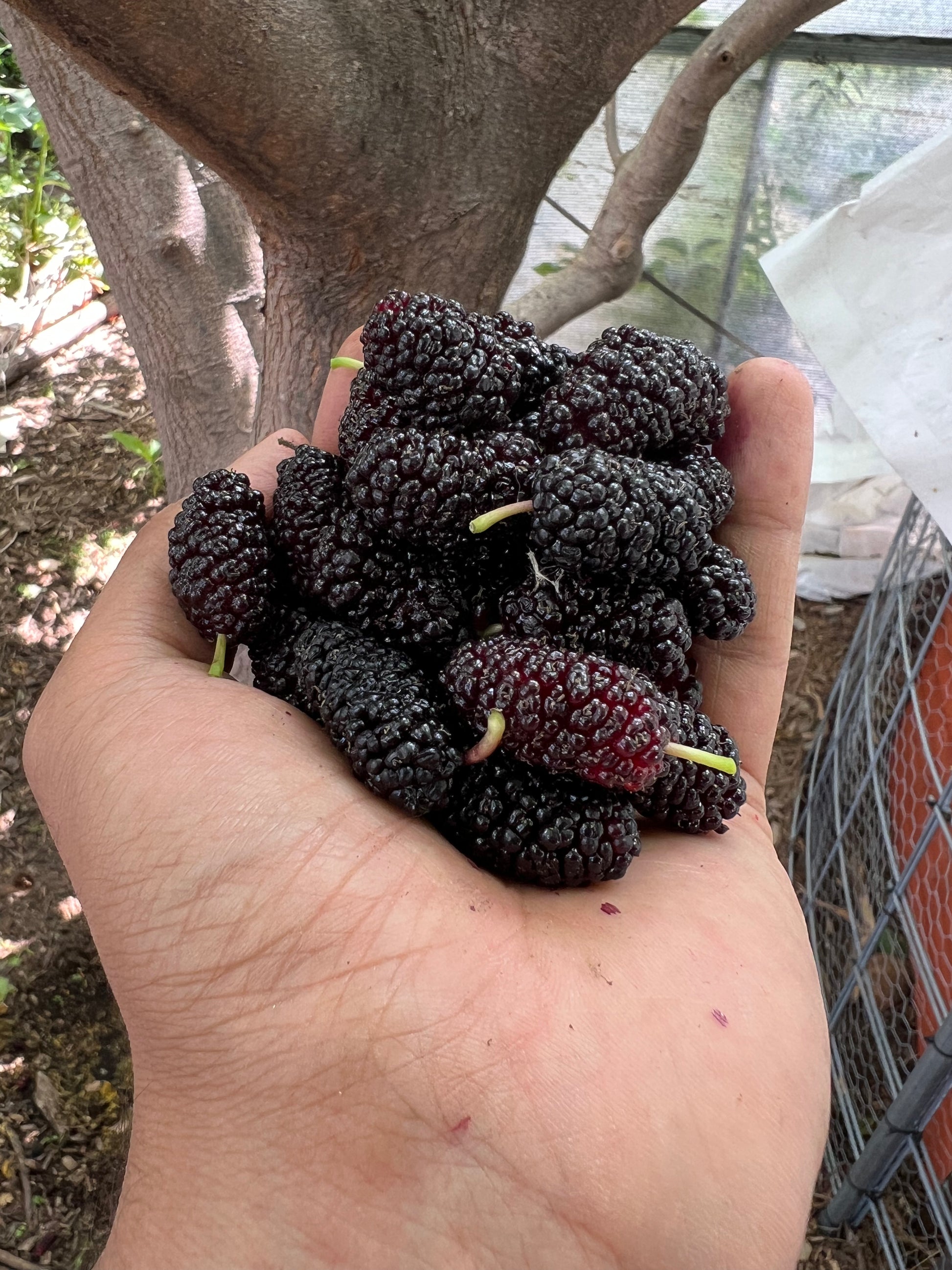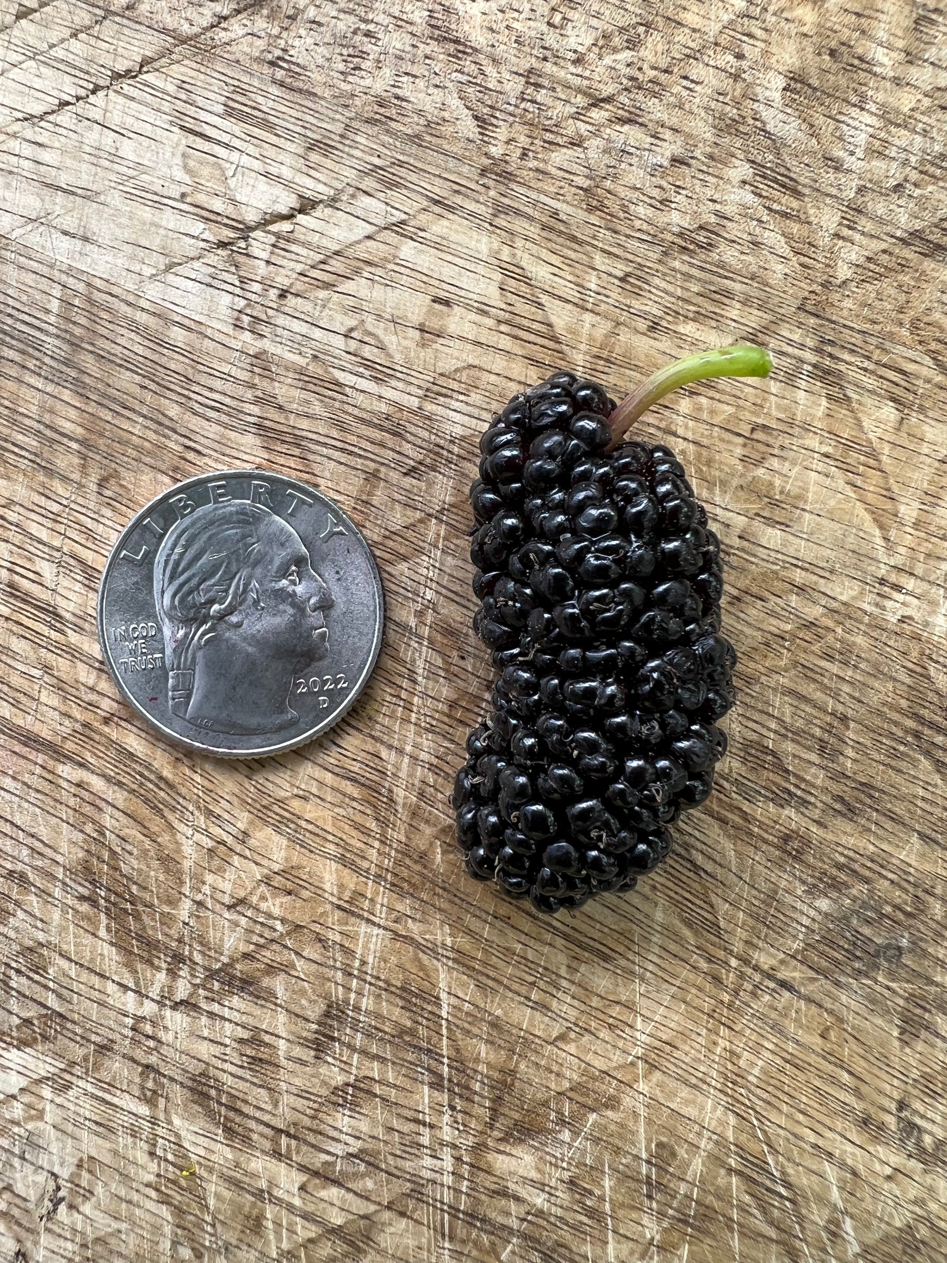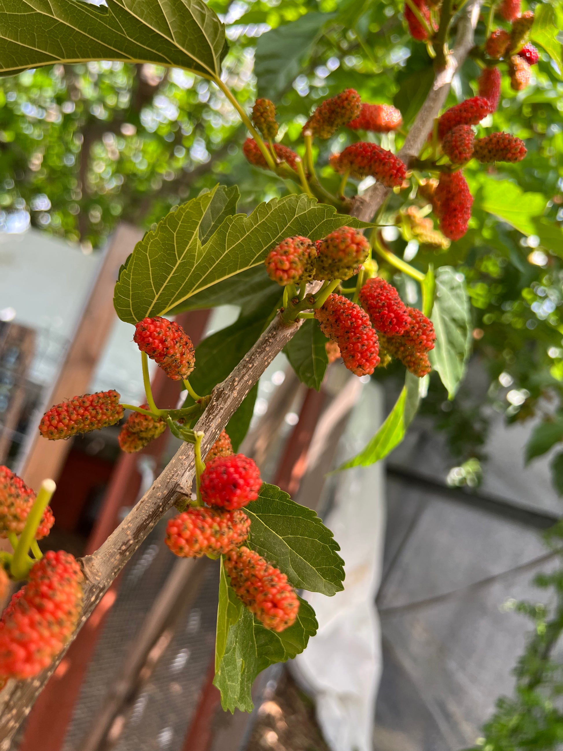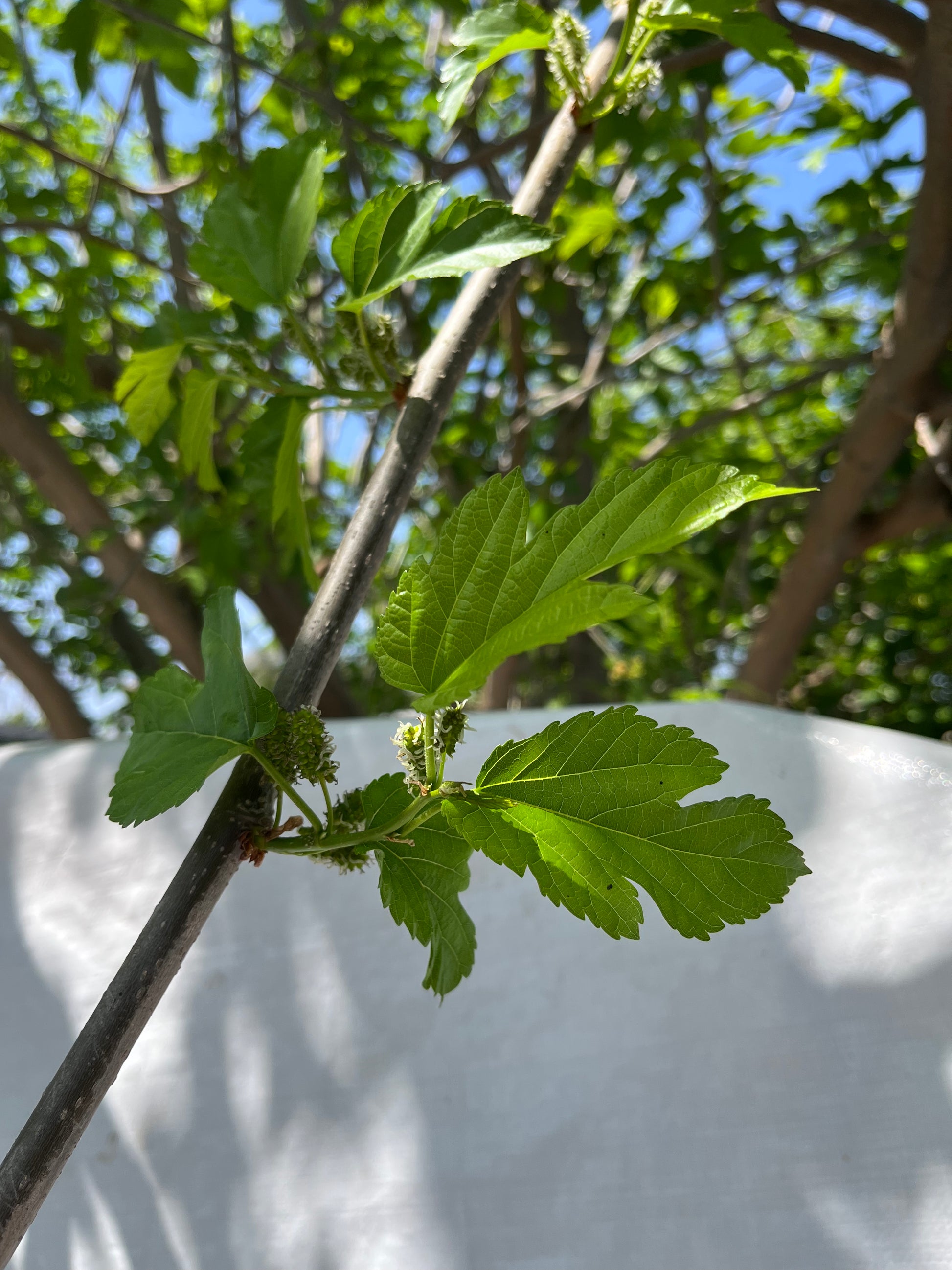 The Shangri La Mulberry, Morus alba 'Shangri La', produces plump fruit that is both sweet and tart. The tree can grow up to 20 feet tall and has heavily lobed leaves. The Shangri La is very productive and is rather drought tolerant.
