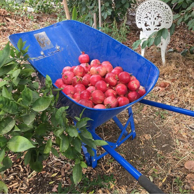 A Sarvodaya exclusive variety, from Farmer Rishi’s parent’s house. Ruby Heart is a highly productive, large fruited pomegranate. Both the skin and arils have a deep, glossy ruby color. The arils are medium size, with an intense but well balanced sweet and tart flavor. Ruby heart makes for excellent fresh eating, and a very rich luxurious juice.